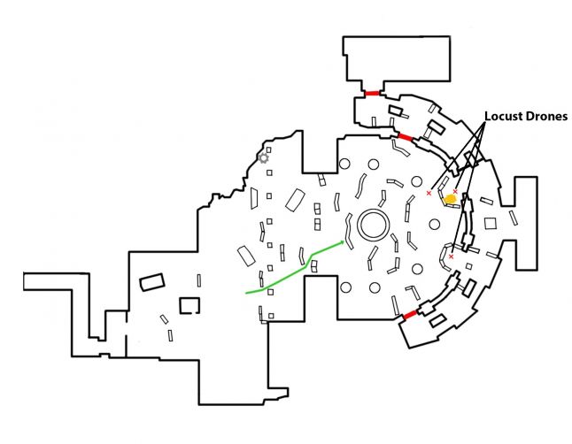The role player triggers the appearance of Locust Drones, when they get into close proximity of the fountain. The Gunner class Drone takes upwards a position in the left open doorway to operate the Troika (a mounted heavy machine gun), and another Drone known every bit a Spotter takes cover in the sandbag emplacement in the right open doorway. These ii Drones hold their fortified positions, whilst a tertiary free roaming drone vaults over the sanbags in the left open doorway and skirts around the edge of the killzone.