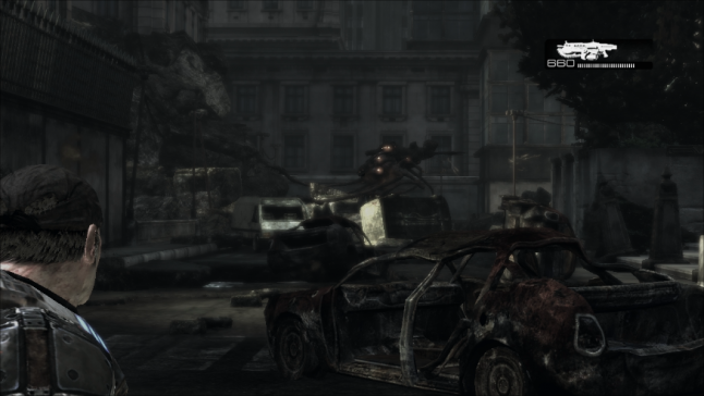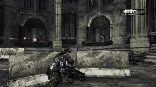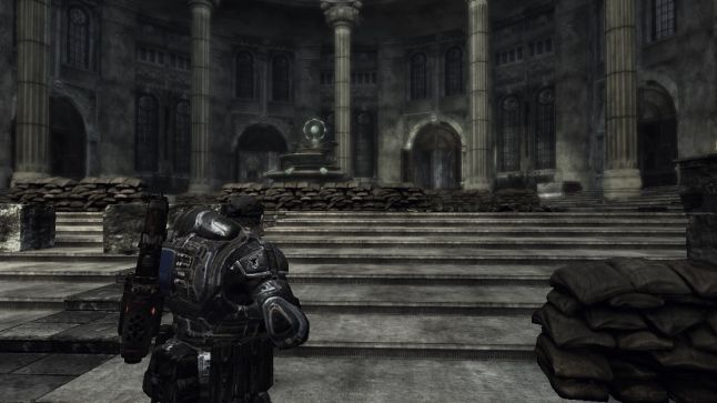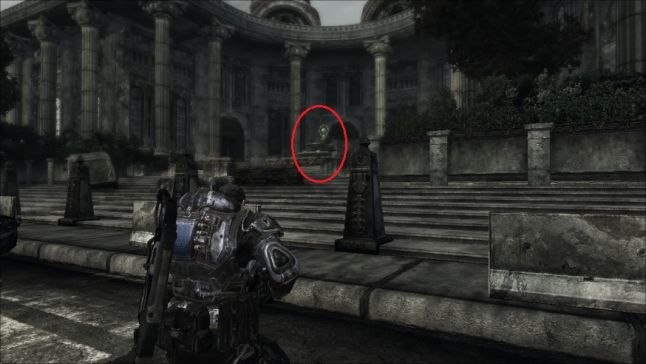 This setup efficiently reuses the same exterior combat area for the final face off, yet at the same time makes it experience different past reversing the situation. This is a sommon occurrence of the Gears of War gainsay encounter blueprint, where a player is tasked with launching an attack on a location so defending it once that has been accomplished. The fronts have been redirected at present that the Gears soldiers and the Locust enemy are on opposite sides from the previous engagement. The gameplay is significantly different, although the aforementioned space is existence used. It is no longer about advancing on a position and gaining ground, but now nearly staying in a confined portion of the combat bowl and property ground. Locust Drones are spawned from the bootom end of the plaza steps and try to advance up towards the player'due south position. The thespian now has the advantage of the loftier basis and the option to put the Troika to devastating utilize, despite the increased number of Drones. Plus the gainsay range is far greater from the positon of the Troika to the enemy forepart.