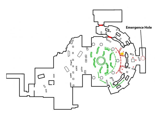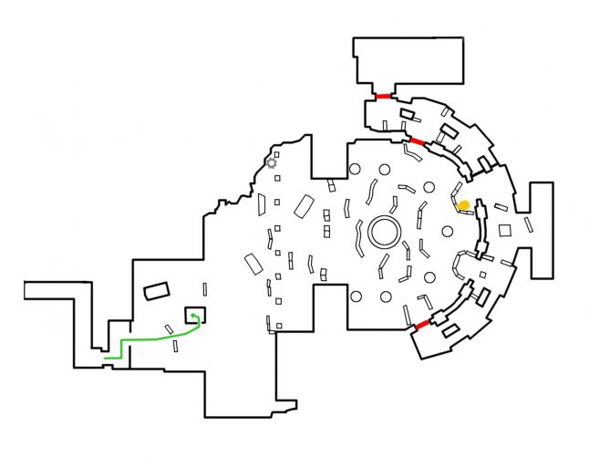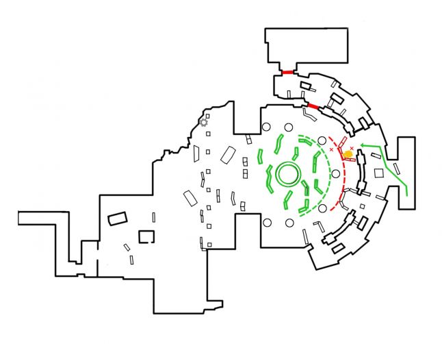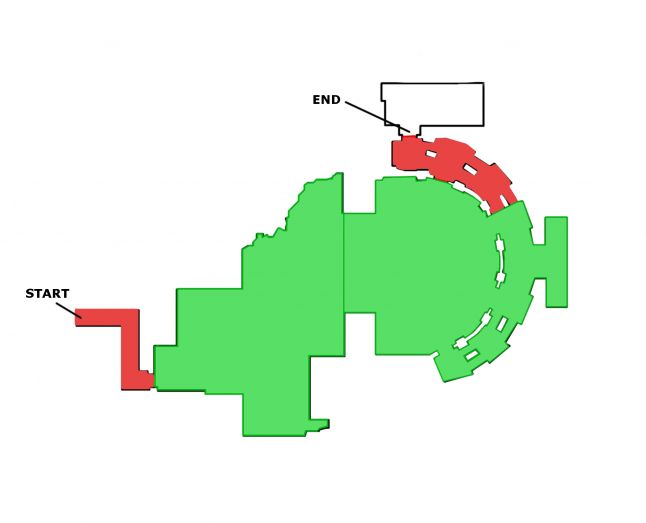 This is the footprint of the Knock Knock level visualised from a loftier level hourglass colour coded perspective. The red corridors bookend the green gainsay bowl. I've divided the combat bowl in half every bit the left half isn't really utilised for combat. An important note is the asymmetry of the combat bowl, as it helps the histrion distinguish end side from another.