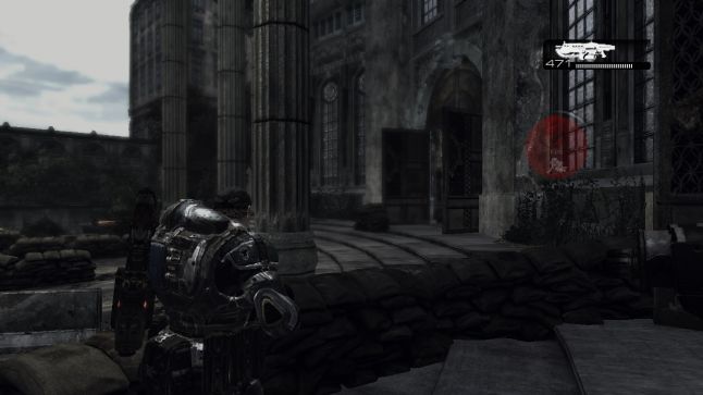 The actor's territory and the enemy territory are clearly divers with the corresponding fronts, by the timing of the introduction of the Locusts with the actor'southward position. The player doesn't get to advance any further than the cover surrounding the fountain, before the Locusts brand their presence known. The suppressive fire they lay downwards also stops the player from advancing whatsoever farther forward. The ally squad members also take cover within this area, adding more proof that it is the player'due south territory. Two Locusts concur positons within the two sandbag emplacements, conveying the Locust's territory. The ane roaming Locust Drone helps to brand the standoff non experience too static, and provides some light harassment for the marry NPCs to brand them experience involved in the date and not come across as sitting idly by.