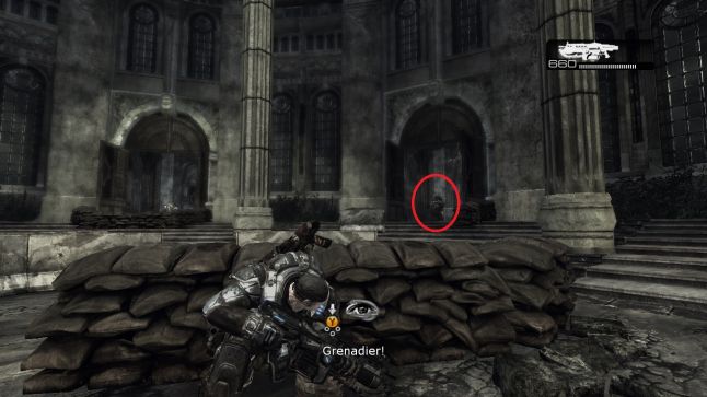 The situation is escalated slightly by the appearance of a Grenadier (a Locust Drone class type that wields a shotgun) bursting from the closed locked door on the right. The animation helps to bring attending to his presence, but it is besides chosen out to the thespian by an ally NPC and is marked as a signal of interest. Further encouraging the player to confront the Grenadier and accept this newly attainable road, is the amount of concentrated cover that bridges the player enemy territory to this doorway.