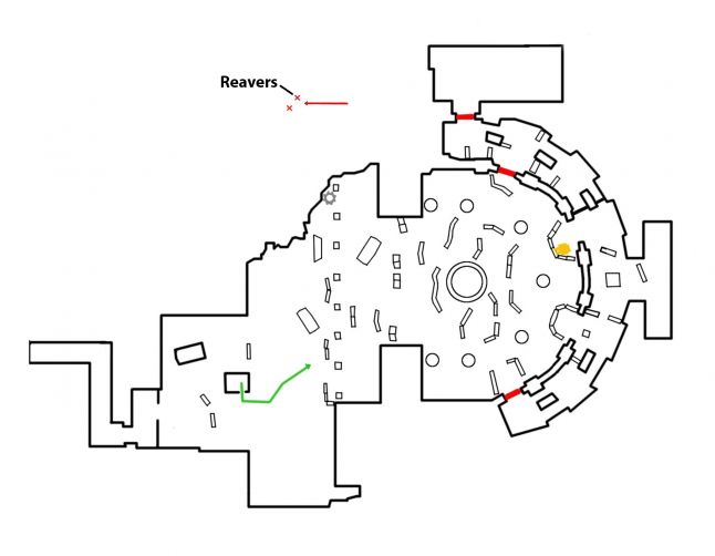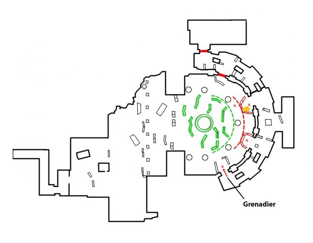 The player is afforded a short up close look at the facade of the edifice, where they can run into four large biconvex doorways. The two centre ones are open up and the two outer ones are closed. The open doorways provide a strong combat focus for the player of where the threat will originate from.