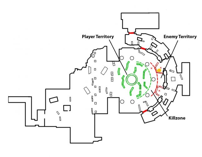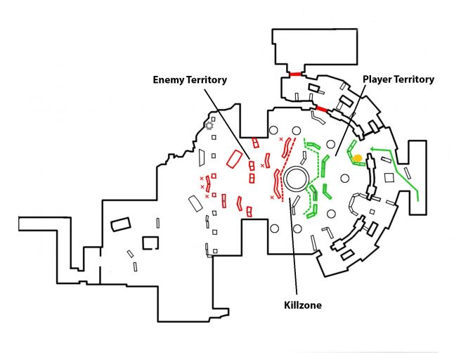 - Killzone (aka No Man's State, Killing Ground or Expressionless Zone) - The space between the two Fronts defining the two seperate territories, by consisting of little to no cover. As its namesake suggests, information technology will almost certainly mean the finish of whoever is caught in here. This is the hurdle that the histrion must overcome to win the battle.