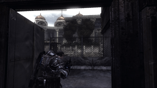 The histrion is pulled towards the direction of the House of Sovereigns past a cardinal fountain, that serves every bit visual lure and landmark. The tension continues to build through the utilize of hushful voice chatter and furthermore with a scripted result of 2 Reavers triggered just before reaching the steps. They briefly come in and out of view as they scour the adjacent street, just beyond the level boundary to the left. Proceeding to explore this direction volition uncover a COG tag, one of the game's collectables.