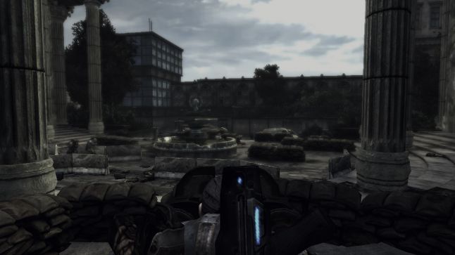 As the actor ascends the plaza steps, they begin to see various sandbag emplacements and roadblocks positioned around the surface area, in improver to structural objects such equally pillars and cement blocks. This is the opportunity for the player to get a lay of the land and pre-emptively assess their surround, taking mental notes of where they can take cover and how they tin can navigate the space safely by using cover-to-encompass move.